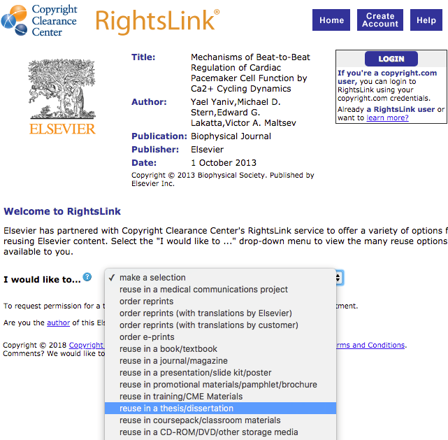 Many journals delegate permission grants to the Copyright Clearance Center. If not, they will likely provide usage terms directly on their site. Typically, you’ll be directed to an online permissions form hosted by the Copyright Clearance Center. If it’s your first time using their service, you’ll need to create an account. Once your account is set up, you’ll return to the form to specify how you wish to use the material, selecting options like “reuse in an article” or “for a thesis/dissertation” from a dropdown menu (see image below).